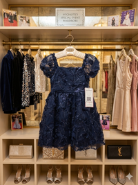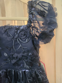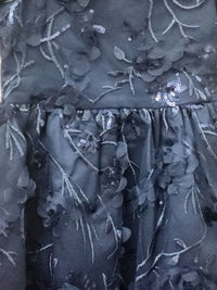Charming navy dress with 3D floral appliqués. Sparkling sequin embroidery adds subtle shine. Puff sleeves and a full skirt for a festive look. Soft lining for comfortable wear. Ideal for special events and celebrations.