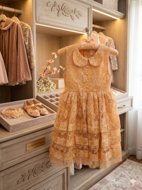 This elegant lace dress by Think Pink is perfect for special occasions. The intricate golden lace design adds a touch of sophistication. Golden button adorns front placement and back closure for extra stately style. Ideal for making your little one feel special.