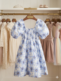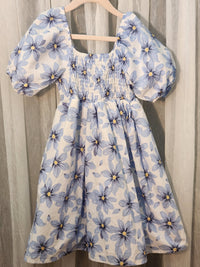 Playful puff sleeves and a shirred bodice. Full skirt with soft floral print. Lightweight cotton look for easy movement. Sweet, summery floral for daytime events.