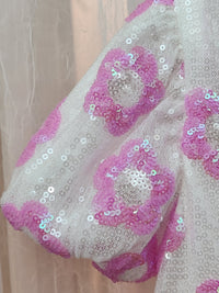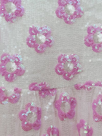 Sparkling pink floral sequin dress for special occasions. Soft white base with pink sequin flower accents creates a playful, festive look. Puff sleeves and a ruffled hem add charming detail. Easy-to-wear design with comfortable fit for active kids.