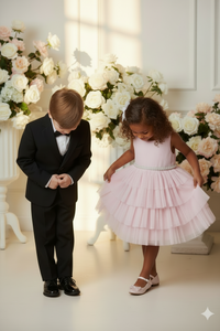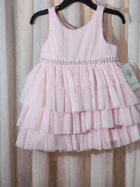 Sweet sleeveless party dress in soft pink. Layered tulle tiers with subtle sparkle. Pearl-accented waist adds a classy touch. Perfect for special occasions.
