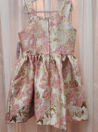This Bonnie Jean sleeveless party dress features a beautiful floral jacquard fabric with layered fabric flowers at the waist and a full skirt with gold accent details. New with tags (NWT) and ready to wear.